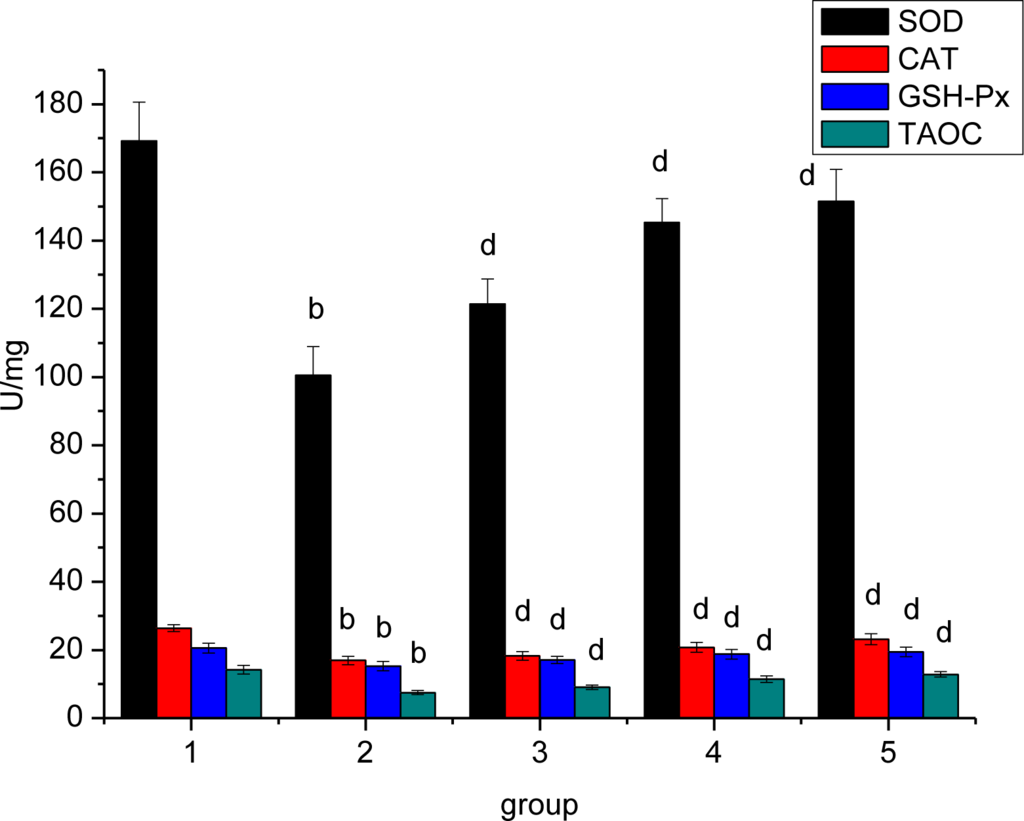 Effect of Ligusticum wallichii extract on myocardium SOD, CAT, GSH-Px and TAOC activities. b P < 0.01 compared with SO control group; d P < 0.01 compared with IR model group. Group 1: sham operation (SO); group 2: ischemia reperfusion (IR); group 3: Ligusticum wallichii extract (LWE) 0.2 g/kg body weight; group 4: LWE 0.4 g/kg body weight; group 5: LWE 0.6 g/kg body weight.