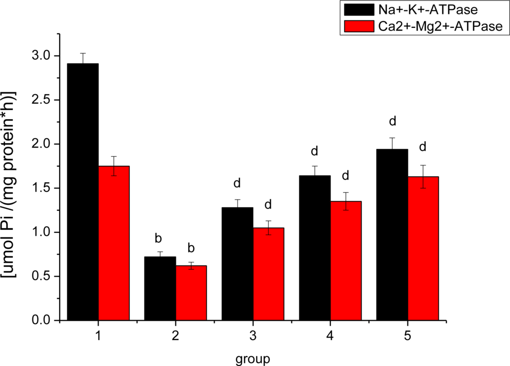 Effect of Ligusticum wallichii extract on myocardium Na+-K+-ATPase and Ca2+-Mg2+-ATPase activities. b P < 0.01 compared with SO control group; d P < 0.01 compared with IR model group. Group 1: sham operation (SO); group 2: ischemia reperfusion (IR); group 3: Ligusticum wallichii extract (LWE) 0.2 g/kg body weight; group 4: LWE 0.4 g/kg body weight; group 5: LWE 0.6 g/kg body weight.