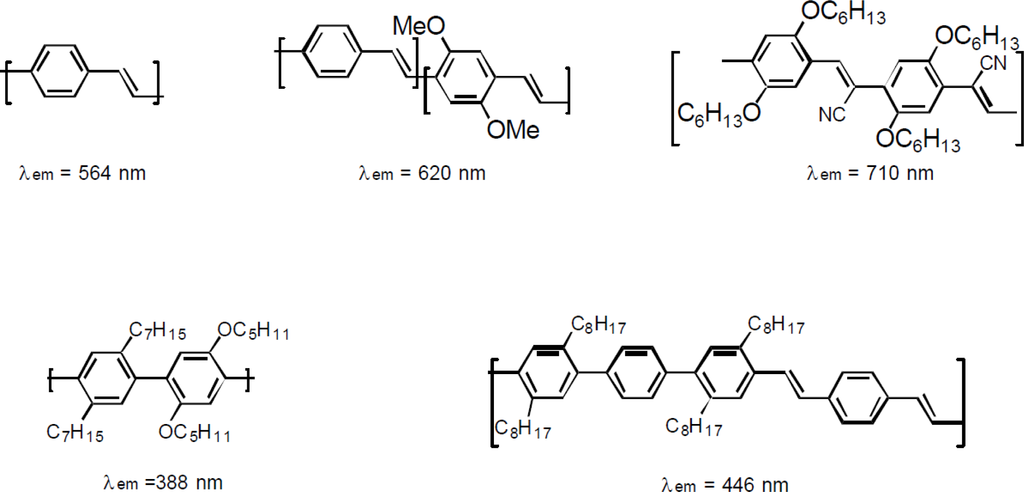 The first use of conjugated polymers was as conductors in applications varying from battery electrodes to long-term stable polymer capacitors [29–37]. However, in the late 1980s, a group headed by Prof. Richard Friend of Cambridge University, UK, discovered a new application for these polymers, namely as an electroluminescent device. His work showed that the semiconductive conjugated polymer poly (p-phenylenevinylene) (PPV) showed electroluminescent characteristics if an appropriate choice of contact layers was made. Since then, tremendous progress in this field has been made in many aspects such as fundamental science in order to realize commercial applications, opportunities for processing, device structures and performances in addition to new conjugated polymers and their derivatives as electroluminescent materials [38–51] where some of promising electroluminescent conjugated polymers and their derivatives are shown in Figure 2. Many excellent research papers, patents and reviews were published concerning these aspects, which promoted conjugated polymers to be promising EL materials [52–57].