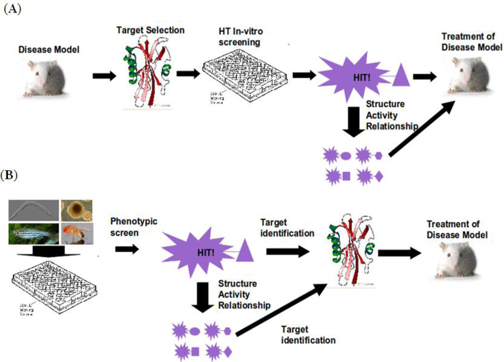 Workflow for two paradigms of drug discovery. (A) Conventional “Target centered” drug discovery; (B) In vivo model based drug discovery.