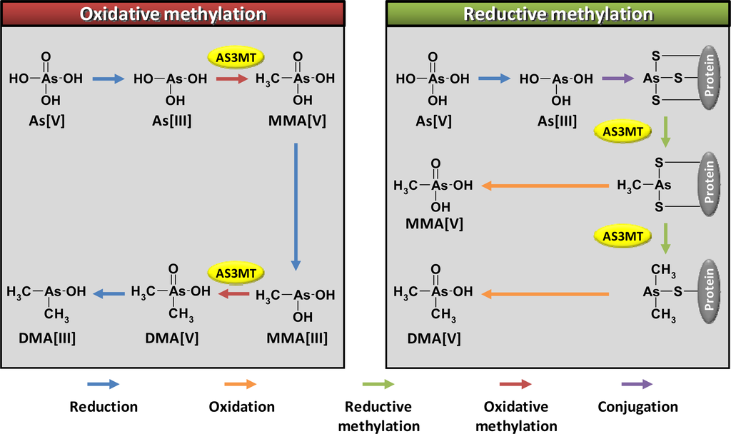 Two distinct pathways of IA methylation (oxidative and reductive) have been proposed (Figure 1). A model of oxidative methylation of IA was proposed by Challenger [23] and Cullen and Reimer [24]. By the combination of oxidative methylation and other pathways, arsenate (As[V]) is transformed to dimethylarsinous acid (DMA[III]); arsenate (As[V]) → arsenite (As[III]) → monomethylarsonic acid (MMA[V]) → monomethylarsonous acid (MMA[III]) → dimethylarsinic acid (DMA[V]) → dimethylarsinous acid (DMA[III]) (Figure 1). However, this sequential pathway does not fully explain the reason why the intermediate species, DMA[V] is detected as a major arsenical in the urine of humans. Methylation has been considered as a detoxification process of IA, because toxicities of MMA[V] and DMA[V] are much lower than that of IA. On the other hand, later studies revealed that MMA[III] or DMA[III] are more cytotoxic and genotoxic than IA [25,26], suggesting that oxidative methylation of IA is a bioactivation process.