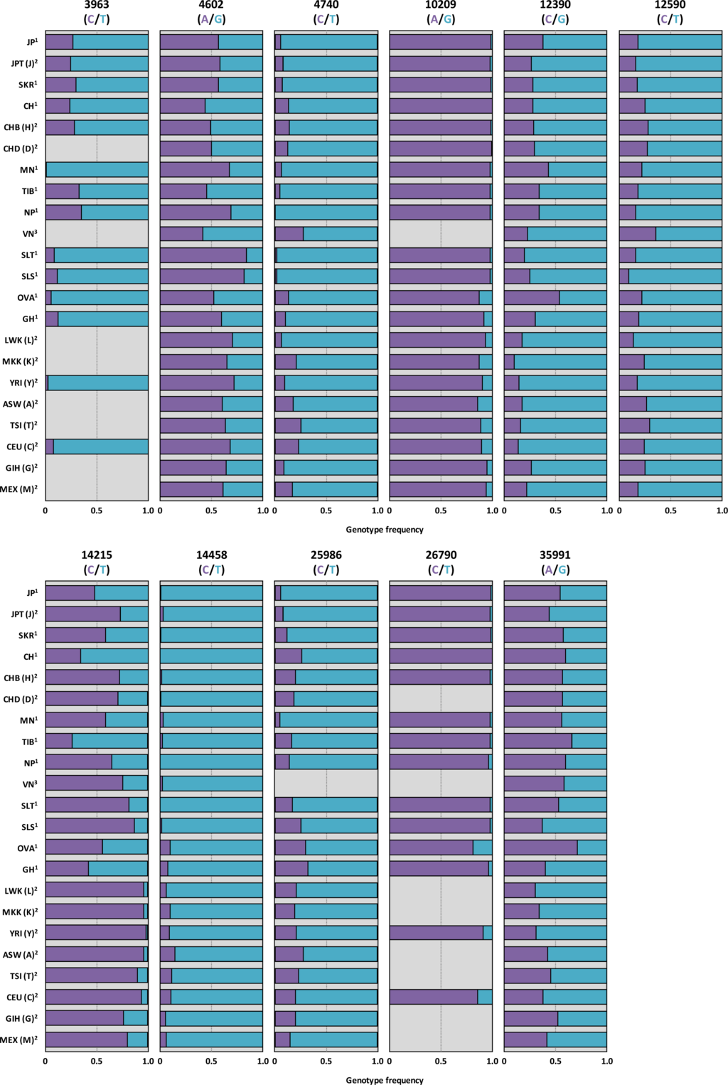 The summarized results are shown in Table 1. The genotype frequencies followed the Hardy–Weinberg Principle except for 4602 (rs7085104) in MN, 6144 (rs17878846) in CH and TIB, 7395 (rs12767543) in SKR and VN, 9749 (rs17881367) in MN, 12390 (rs3740393) in JP, 12590 (rs3740392) in JP, 14215 (rs3740390) in JP, SKR, MN, and GH, 26790 (rs11191445) in JP, 35587 (rs11191453) in JP, SKR, MN, TIB, and VN, 37616 (rs4568943) in JP, CH, Mongolians, and OVA, and 37950 (rs17879819) in OVA. Because no genotyping error was observed in duplicate analysis, the reason that some genotype frequencies did not follow the Hardy–Weinberg Principle may probably be due to the small sample size. The allele frequencies of SNPs of Japanese in Tokyo, Japan (JPT (J)), Han Chinese in Beijing, China (CHB (H)), Chinese in Metropolitan Denver, Colorado (CHD (D)), Luhya in Webuye, Kenya (LWK (L)), Maasai in Kinyawa, Kenya (MKK (K)), Yoruban in Ibadan, Nigeria (YRI (Y)), African ancestry in Southwest USA (ASW (A)), Tuscan in Italy (TSI (T)), Utah residents with Northern and Western European ancestries from the CEPH collection (CEU (C)), Gujarati Indians in Houston, Texas (GIH (G)), and Mexican ancestry in Los Angeles, California (MEX (M)) that are available in the International HapMap Project [31], were compared with our studies (Figure 3). While the distribution patterns of AS3MT 4602 (rs7085104), 9749 (rs17881367), 12390 (rs3740393), 12590 (rs3740392), and 27215 (rs11191446) polymorphisms were not drastically different among the populations, notable variations were found for other SNPs. For AS3MT 3963 (rs7098825), C alleles were low in SLT, SLS, OVA, GH, YRI (Y) and CEU (C), particularly in MN. NP has no C allele of AS3MT 4740 (rs12416687). Relatively high frequencies of AS3MT 7395 (rs12767543) A allele and 8979 (rs72920657) A allele were found in CH and VN, respectively. AS3MT 6144 (rs17878846) A allele, AS3MT 37616 (rs4568943) A allele, and AS3MT 37950 (rs17879819) C allele frequencies in OVA and GHA populations were higher than Asians, but comparable with those in MN. Frequencies of AS3MT 10209 (rs3740394) A allele, AS3MT 26790 (rs11191445) C allele, and AS3MT 35991 (rs10748835) A allele in Asians (except for AS3MT 35991 (rs10748835) A allele in OVA) were higher than those in other ethnic groups, while the opposite trend was observed for AS3MT (rs11191439) T allele. For AS3MT 14215 (rs3740390), the allele distribution was different even within Chinese (CH vs CHB(H) and CHD(D)) and African groups (OVA and GH vs LWK(L), MKK(K), YRI(Y), and ASW(A)). TIB also showed a different pattern of AS3MT 14215 (rs3740390) allele from other Asian populations. Relatively lower C allele frequency of AS3MT 25986 (rs7085854) was detected in JP, JPT, SKR, and MN. TIB showed different allele distribution of AS3MT 35587 (rs11191446). To understand these variations, further research is necessary.