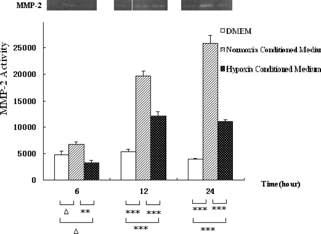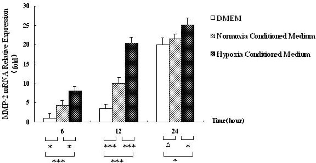 Hepatocyte conditioned medium upregulates MMP-2 mRNA expression in HSCs. Relative MMP-2 mRNA level was determined by Real-time RT-PCR in HSC-T6 cells treated with hepatocyte conditioned medium, serum-free DMEM medium and hepatocyte-conditioned control medium (normoxia conditioned medium) for 6, 12 and 24 h. Data were expressed as means ± SEM from 3 independent experiemnts. * p < 0.05, ** p < 0.01, *** p < 0.001, and Δp > 0.05.