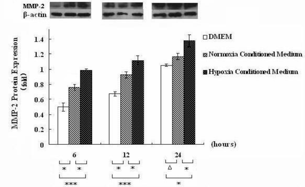 Our prior study has shown that hypoxia could regulate the expression of MMP-2 mRNA in HSC-T6 cell [16,17,21]. To investigate whether hypoxic hepatocytes affect the expression of MMP-2 mRNA in HSC-T6 cells, we measured MMP-2 mRNA level in rat HSC-T6 cells cultured in hepatocyte-conditioned medium for 6, 12 and 24 h, respectively. As shown in Figure 1, real-time RT-PCR analysis showed that MMP-2 mRNA expression was increased in HSC-T6 cells treated with hepatocyte-conditioned medium. Time factor analysis by one-way ANOVA showed that MMP-2 mRNA level in HSC-T6 cells treated with the conditioned medium was significantly higher than that in the controls (p < 0.001). These results indicate that hepatocyte conditioned medium upregulates MMP-2 expression in HSCs. To provide further evidence for this, we performed Western blot analysis to examine MMP2 expression at the protein level in HSC-T6 cells cultured with hepatocyte-conditioned medium at 6, 12 and 24 h, respectively. The results showed that MMP-2 protein was induced in HSC-T6 cells treated with the hepatocyte-conditioned medium. The protein level of MMP-2 at 12 h was higher than that at 6 h and 24 h (Figure 2). Taken together, these data suggest that MMP-2 expression in HSC-T6 cells exhibited a slow response to hepatocyte-conditioned medium.