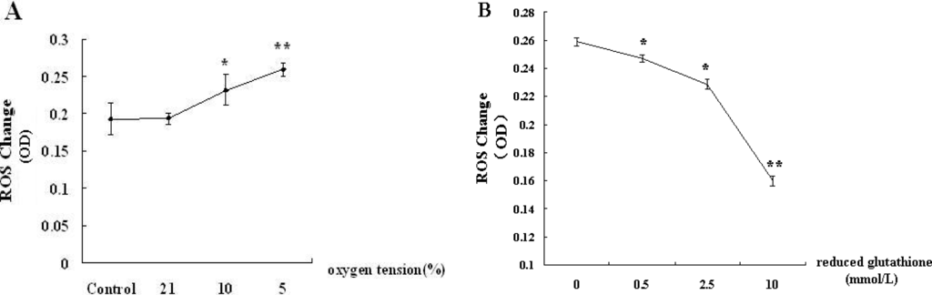 GSH antagonizes the generation of ROS in the supernatants of hepatocytes. (A) BRL-3A cells were treated with different levels of oxygen (5% O2, 10% O2 and 21% O2) for 12 h. ROS in the supernatants was quantified using a colorimetric assay. Data were expressed as means ± SEM from 3 independent experiments. * p < 0.05, ** p < 0.01 vs. Control; (B) BRL-3A cells were treated with GSH (0, 0.5, 2.5, 10 mmol/L) and then exposed to 5% oxygen for 12 h. The ROS level in the hypoxia conditioned medium was analyzed. Data were expressed as means ± SEM from 3 independent experiments. * p < 0.05, *** p < 0.001 vs. group treated with 0 mmol/L GSH.
