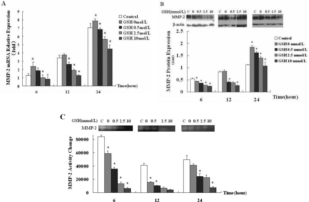 ROS-neutralized hepatocyte conditioned medium downregulates MMP-2 expression and activity in HSCs. BRL-3A cells were treated with reduced glutathione (0, 0.5, 2.5, 10 mmol/L) and exposed to 5% oxygen for 12 h. Then the supernatant was collected and HSC-T6 cells were cultured with ROS-neutralized-hepatocyte-conditioned medium for 6, 12 and 24 h. As a control, HSC-T6 cells were cultured in serum-free DMEM medium. (A) relative MMP-2 mRNA level in HSC-T6 cells were determined by Real-time RT-PCR. Data were expressed as means ± SEM from 3 independent experiments. * p < 0.05 vs. the former group; (B) MMP-2 protein level in HSC-T6 cells was detected by Western blot. Shown were representative blots from three independent experiments with similar results; (C) MMP-2 activity measured by gelatin zymography.