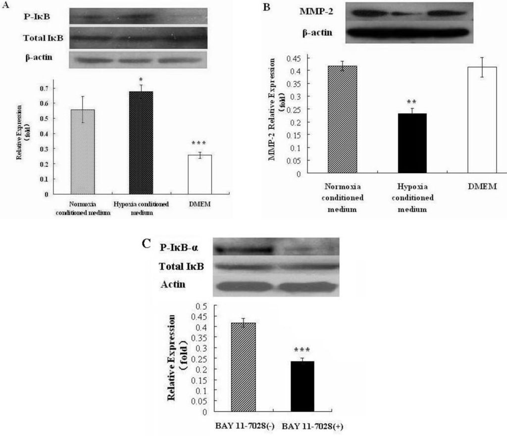 To provide further evidence that ROS generated in hepatocytes contributes to the upregulation of MMP-2 expression in HSC-T6. Last, we characterized the potential mechanism by which ROS regulates MMP-2 expression in HSCs. By probing phospho-IκB-α protein level as an indication of the activation of NF-κB signaling, we found that hypoxia conditioned medium induced increased phospho-IκB-α protein level in HSC-T6 cells, corresponding to increased MMP-2 protein level. Furthermore, inhibition of NF-κB signaling by specific inhibitor BAY 11-7082 led to reduced MMP2 protein level in HSC-T6 cells. Based on these data we speculate that NF-κB signaling is an important, although not exclusive, signaling pathway that mediates ROS-induced MMP-2 expression in HSCs.