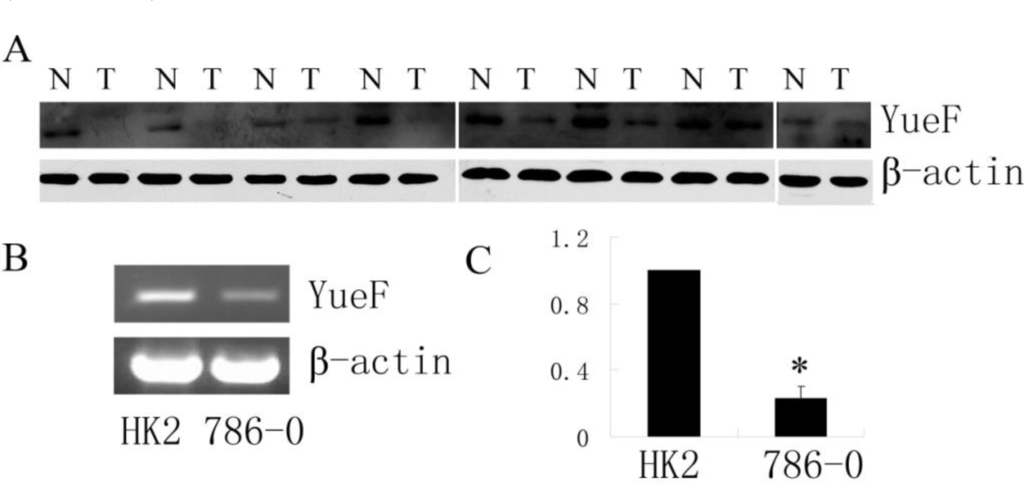 Although the tumor-suppressive action of YueF in hepatoma cells has been previously reported [5], the biological role of YueF and the molecular pathways through which YueF upregulation suppresses the growth of renal cell carcinoma (RCC) were not elucidated in earlier studies. YueF is expressed at high levels in normal human hepatic cells and tissues, but barely detectable in hepatoma cells and tissues. Overexpression of YueF could inhibit cell proliferation, induce cell apoptosis and promote p53 expression in hepatoma cells, indicating that YueF might be a novel candidate tumor suppressor gene involved in hepatocarcinogenesis.
