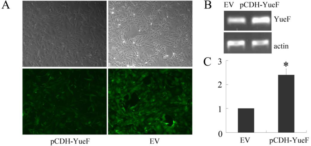 Human RCC 786-0 cells were cultured in Eagle’s MEM supplemented with 10% foetal bovine serum (FBS) (Hyclone, Logan, UT, USA) at 37 °C under 5% CO2. The 786-0 cells were infected at a multiplicity of infection (MOI) of 5 with either lentivirus containing the YueF gene (pCDH-YueF) or empty virus (EV) containing 6 μg/mL of polybrene according to the manufacturer’s instructions. RT-PCR was used to examine gene expression in the 786-0 cells infected with pCDH-YueF. The following primers were used in the RT-PCR: YueF sense primer 5′-GGCGTGGAGACGAGATAA-3′, YueF anti-sense primer 5′-GAGGGTCAATGGCTAATGC-3′, β-actin sense primer 5′-TCCCTGGAGAAGAGCTACGA-3′, and β-actin anti-sense primer 5′-TCGTCATACTCCTGCTTGCT-3′.
