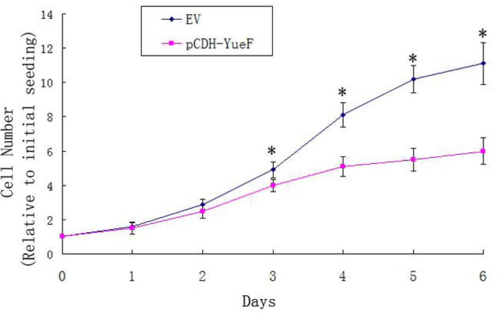 The effects of YueF overexpression on the proliferation 786-0 cells were examined. The growth curve results determined with an MTT assay showed that the overexpression of YueF (pCDH-YueF) significantly reduced the proliferation rate compared to the empty virus (EV)-infected cells (P < 0.05, Figure 3).