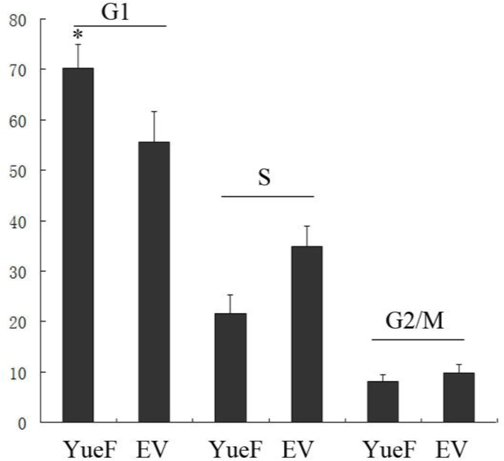 Cell cycle arrest at the G1 phase was induced in the YueF-overexpressing 786-0 cells (YueF) compared to the empty virus (EV)-infected 786-0 cells. (*P < 0.05)