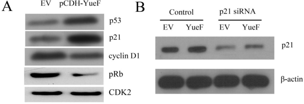 Huang et al. showed [5] that YueF overexpression enhanced p53 promoter activity and p53 expression in hepatoma cells. Here, we also showed that p53 expression increased in YueF-overexpressing cells (Figure 5A). To further explore how YueF overexpression induced cell cycle arrest, we examined the relative expression levels of p21 (a major cyclin-dependent kinase inhibitor) in YueF-overexpressing 786-0 cells (pCDH-YueF) and empty virus-infected 786-0 cells (EV) with immunoblot analysis, which showed a dramatic elevation in p21 levels in the YueF-overexpressing 786-0 cells (Figure 5A). Consistent with the G1-arrest phenotype, the YueF-overexpressing cells (pCDH-YueF) showed substantially lower cyclin-D1 and pRB (Ser780) levels compared to the control cells (EV), whereas there was no change in the CDK2 protein levels (Figure 5A).