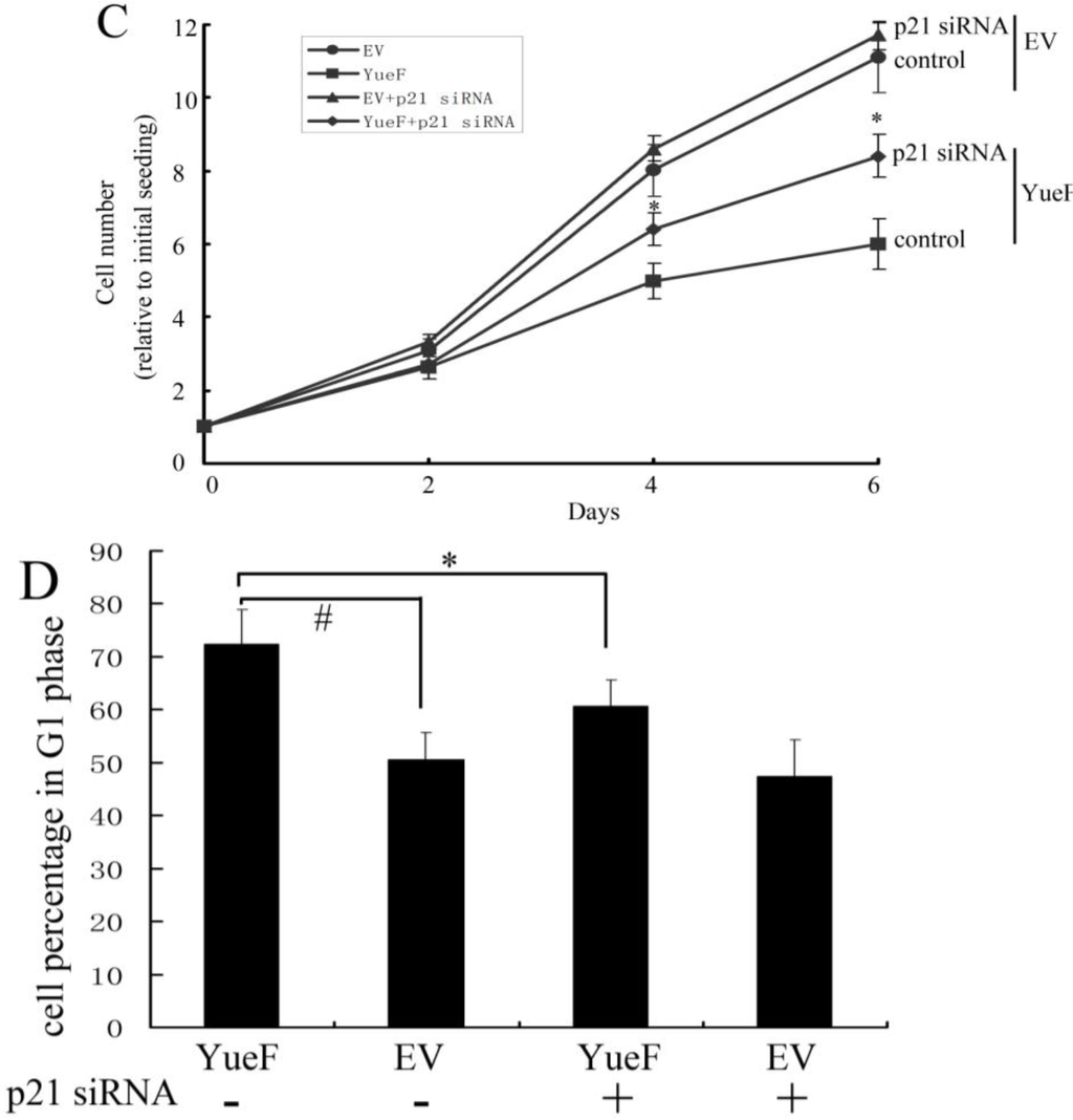 To determine whether an elevated p21 level is at least partially responsible for the YueF-induced growth suppression of 786-0 cells, we silenced p21 expression in YueF-overexpressing 786-0 cells (pCDH-YueF) and empty virus (EV)-infected 786-0 cells with transient transfection of a pool of p21-specific siRNAs and scrambled control siRNA. Western blot data (Figure 5B) confirmed that p21 expression could be suppressed by p21 siRNA treatment. In contrast, silencing p21 expression led to substantially faster growth of the YueF-overexpressing 786-0 cells (Figure 5C). The YueF-overexpressing 786-0 cell counts remained lower than the corresponding values for the EV-infected cells, suggesting that the p21 upregulation is only partly responsible for the growth inhibition of 786-0 cells induced by YueF overexpression. Additionally, silencing p21 expression rescued the G1 arrest induced by YueF overexpression to some extent (Figure 5D).