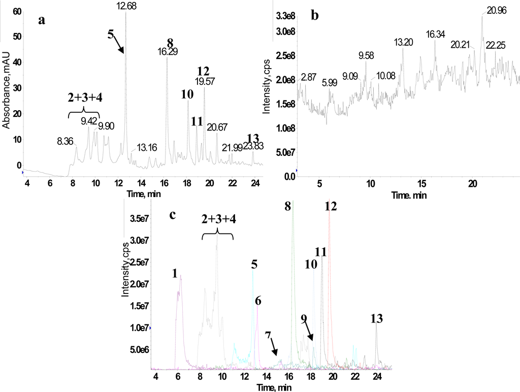 (a) HPLC-UV chromatogram of the crude extract at λ 345 nm; (b) Total ion chromatogram of RRLC-MS in negative ion mode; (c) Extracted ion chromatogram of the crude extract.