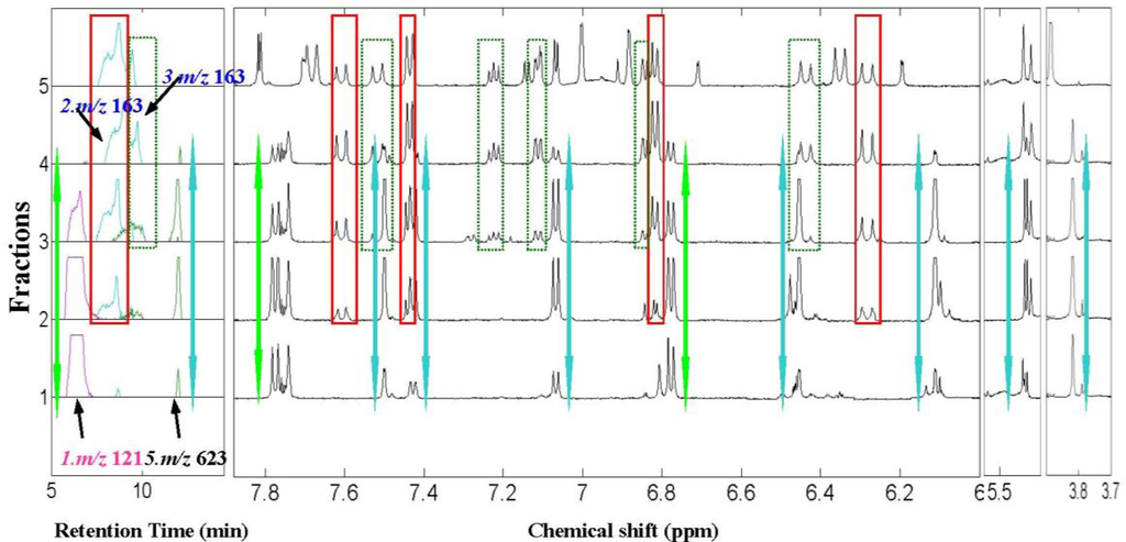A series of fractions were taken for 1H NMR and RRLC-MS analysis, and after data processing the signal amplitude co-variation between the 1H NMR and XICs signals were visualized together to produce the 1H NMR/RRLC-MS PDS spectrum of the ethanol extract of Anoectochilus roxburghii (shown in Figure 3). For our applications, the fraction axis (vertical axis) resembled the retention time axis in the chromatogram, and each line represented the XIC and 1H NMR spectra of each fraction. It can be seen that the XICs signals of the 13 constituents including two groups of isomers were lined out on the 1H NMR/RRLC-MS PDS spectrum with suitable separation and eluting in different fractions. Figure 3 shows that, constituent 9 and 10, which were strongly overlapped in the XIC spectrum of the ethanol extract were eluted into different fractions and could be distinguished clearly by the 1H NMR/RRLC-MS PDS spectrum with dark blue and yellow profiles respectively. In addition, one of the three isomers with [M–H]− ion at m/z 163, constituent 4, could also be clearly distinguished from the other two isomers (constituents 2 and 3) owing to its distribution in different fraction ranges, which indicated that this approach could play a prominent role in the chemical structural identification of co-eluted constituents. Based on this visualization tool, the intrinsic correlation between 1H NMR and RRLC-MS data of the same constituent could be discovered easily, such as constituent 4 with orange arrows highlighting the mass/charge (m/z) and chemical shifts (δ) data. In order to illustrate the significant role of the 1H NMR/RRLC-MS PDS spectrum in the structural identification of individual constituents in a complex mixture, we magnified the 1H NMR/RRLC-MS PDS spectrum of the crude extract from fraction 1 to 5 (Figure 4), in which 1H NMR signals of four constituents were highlighted in the same colored square or arrow with corresponding XICs, respectively, and two co-eluted isomers with critically overlapped peaks appeared.