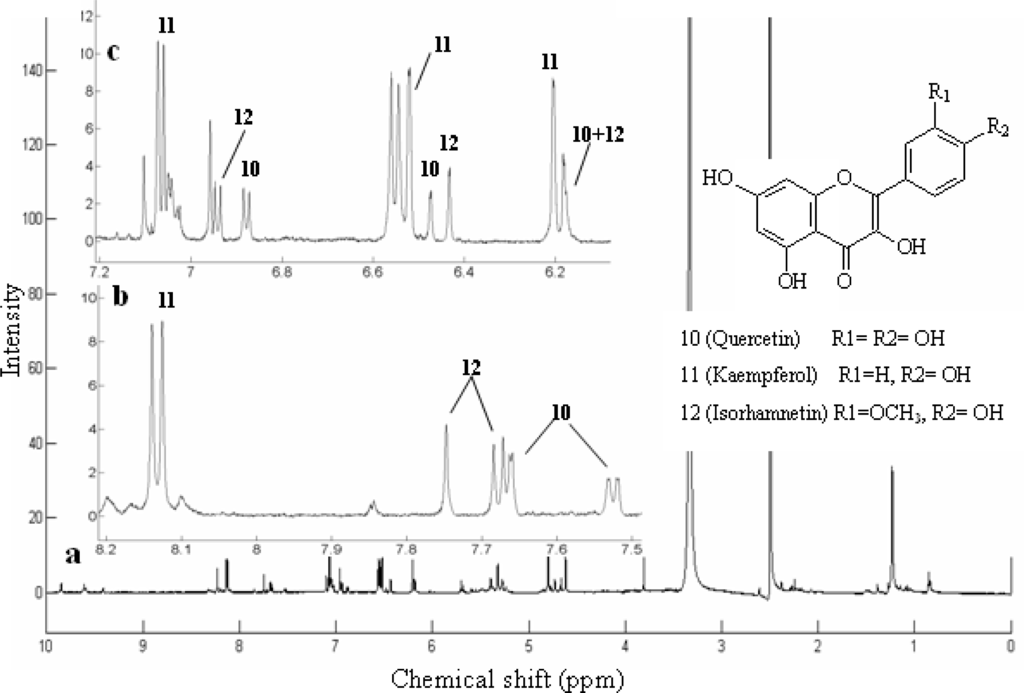 In Figure 3, three peaks in the XIC of m/z 301, 285 and 315 covered almost the same fractions 9–12, which resulted from the co-elution of constituent 10, 11 and 12. The assignment of 1H NMR peaks was difficult due to the overlap of parts of the signals. However, using NMR/LC-MS PDS spectrum, the problem can be approached as follows. Four 1H NMR peaks at the high-frequency region were clearly presented at δ 8.15 (2H, J = 8.8 Hz), 7.07 (2H, J = 8.8 Hz), 6.53 (J = 2.0 Hz) and 6.27 ppm (J = 2.0 Hz), respectively, as observed in the relevant 1H NMR spectra of fraction 11 shown in Figure 6. Subsequently, the signal amplitude dynamic co-variation between the four peaks and the XIC of m/z 301, 285, 315 was co-analyzed. We found that the intensity variation of the above 1H NMR signals from fractions 9 to 11 and that of the XIC peaks at m/z 285 showed the same tendency. Consequently, the columns of the six protons were assigned to constituent 11. In the same way, the other mixed and overlapped protons signals from fractions 9 to 12 were correlated and deconvolved simultaneously, and were assigned to constituents 10 and 12, respectively. Figure 6 shows the complete NMR signal assignment to constituents 10, 11 and 12 in fraction 11. Finally, three flavone aglycones, quercetin, isorhamnetin and kaempferol, with similar structure were identified unambiguously based on the 1H NMR/RRLC-MS PDS spectrum by co-analyzing their 1H NMR peaks, the XIC signals. To our surprise, kaempferol, a most familiar constituent, has not been reported in Anoectochilus roxburghii. In addition, the assignment of –OH signals of quercetin were listed in Table 1 following the results of reported literatures [42,43].