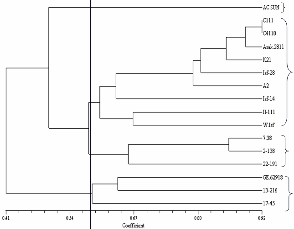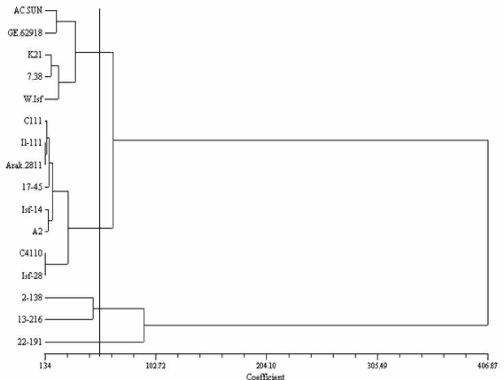- Amini, F; Saeidi, G; Arzani, A. Study of genetic diversity in safflower genotypes using agro-morphological traits and RAPD markers. Euphytica 2008, 163, 21–30. [Google Scholar]