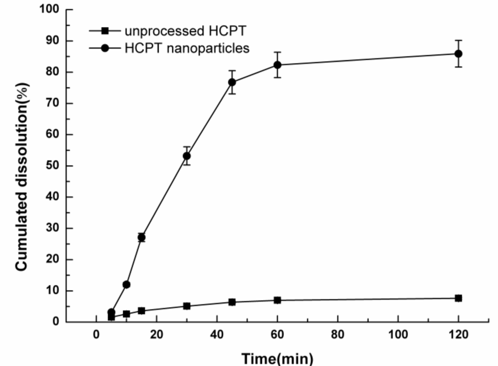 Dissolution profiles of HCPT particles are shown in Figure 10. The HCPT nanoparticles showed a more rapid dissolution than the unprocessed HCPT. After 120 min, the dissolution rate of HCPT nanoparticles and unprocessed HCPT were 85.89% and 7.64%, respectively. The HCPT nanoparticles had solubility eleven times higher than the unprocessed HCPT material. The dramatic increase in drug dissolution rate can be explained by the reduction of particle size resulting in an increased specific surface area. The literature has also discussed how an increase in the amorphous content and porosity of the micronized drugs led to an enhanced dissolution rate [26].