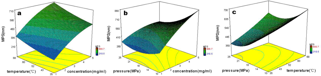 Figure 3 shows the three-dimensional response surfaces which were constructed to show the effects of the SAS process variables on MPS of micronized HCPT (Y). Figure 3a–c shows the interaction effect of precipitation temperature and concentration of HCPT solution, precipitation pressure and concentration of HCPT solution, and precipitation pressure and precipitation temperature on the MPS, respectively. The MPS of micronized HCPT was found to increase with increasing precipitation temperature and concentration of HCPT solution and decrease with increasing precipitation pressure.