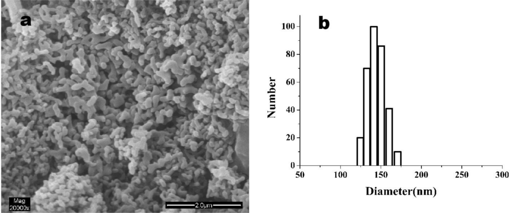 SEM image (a) and particle size distribution (PSD) (b) of HCPT nanoparticles.