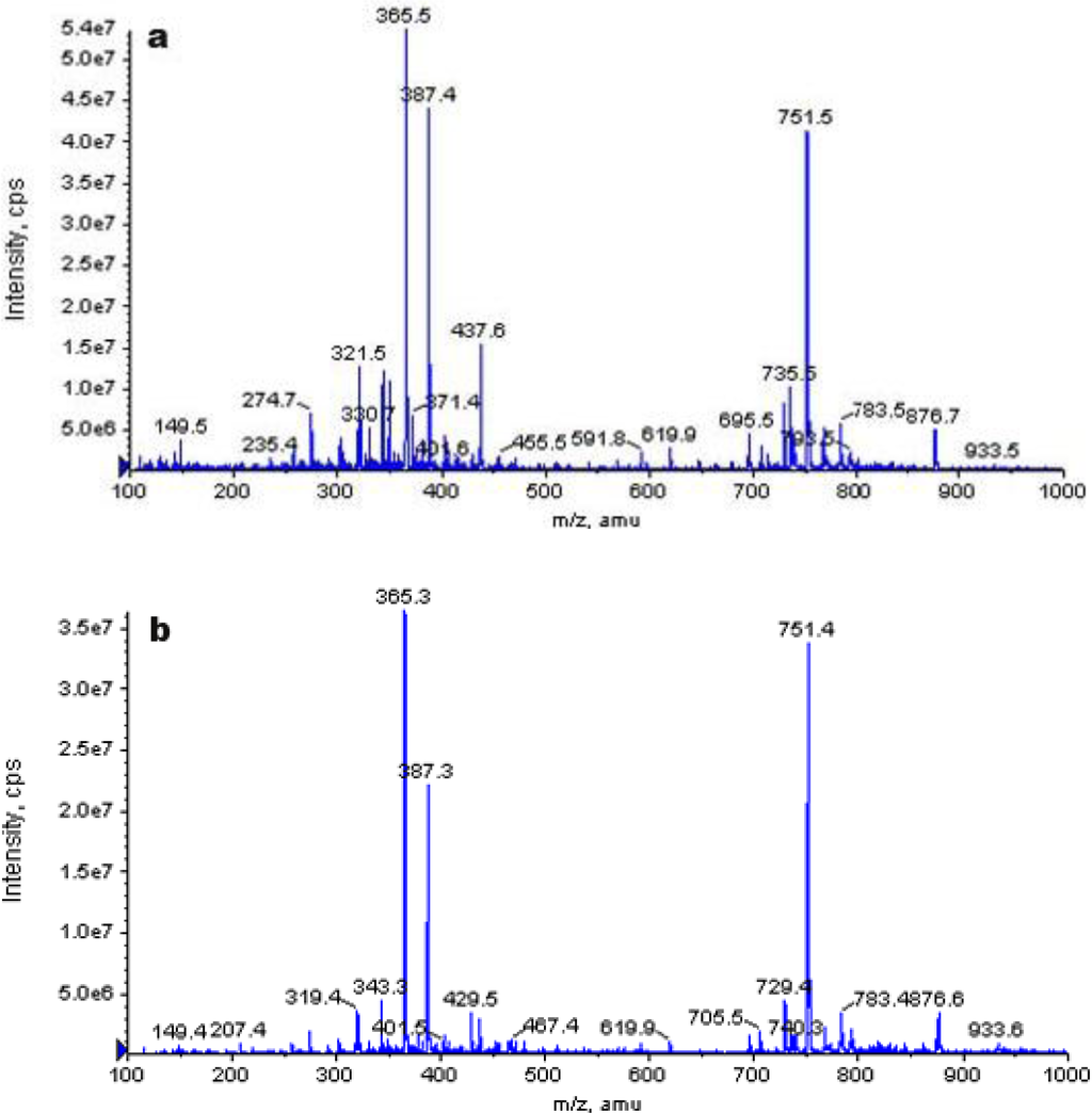 LC-MS spectra of the unprocessed HCPT (a) and HCPT nanoparticles (b).