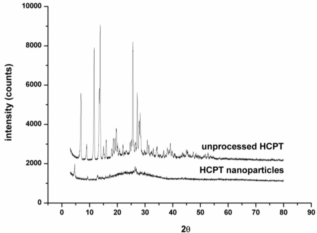 In order to further investigate particles, crystalline XRD analysis was performed. Figure 8 shows the XRD results for unprocessed HCPT particles and HCPT nanoparticles. The presence of several distinct peaks in the XRD of unprocessed HCPT at the diffraction angles of 2θ = 13.821°, 11.659°, 25.640°, 13.521°, 6.900°, 28.260°, 27.919° and 27.219° reveals that the drug is present as a crystalline form. On the other hand, HCPT nanoparticles were characterized by the complete absence of any diffraction peak corresponding to unprocessed HCPT. This fact suggests that HCPT particles after SAS processing are no longer present in crystalline form, but exist in the amorphous state. Less crystalline smaller drug particles are higher in the dissolution rate or bioavailability than crystals and, thus, the therapeutic action is obtained in shorter times.