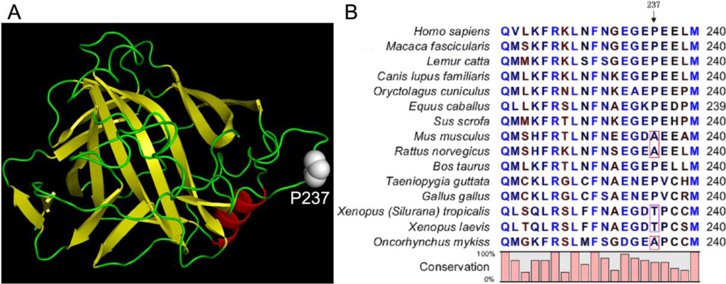 (A) Crystal structure of HCAII (PDB ID 2CBA). Pro237 is highlighted by space-filling model; (B) Sequence alignment of CAII.