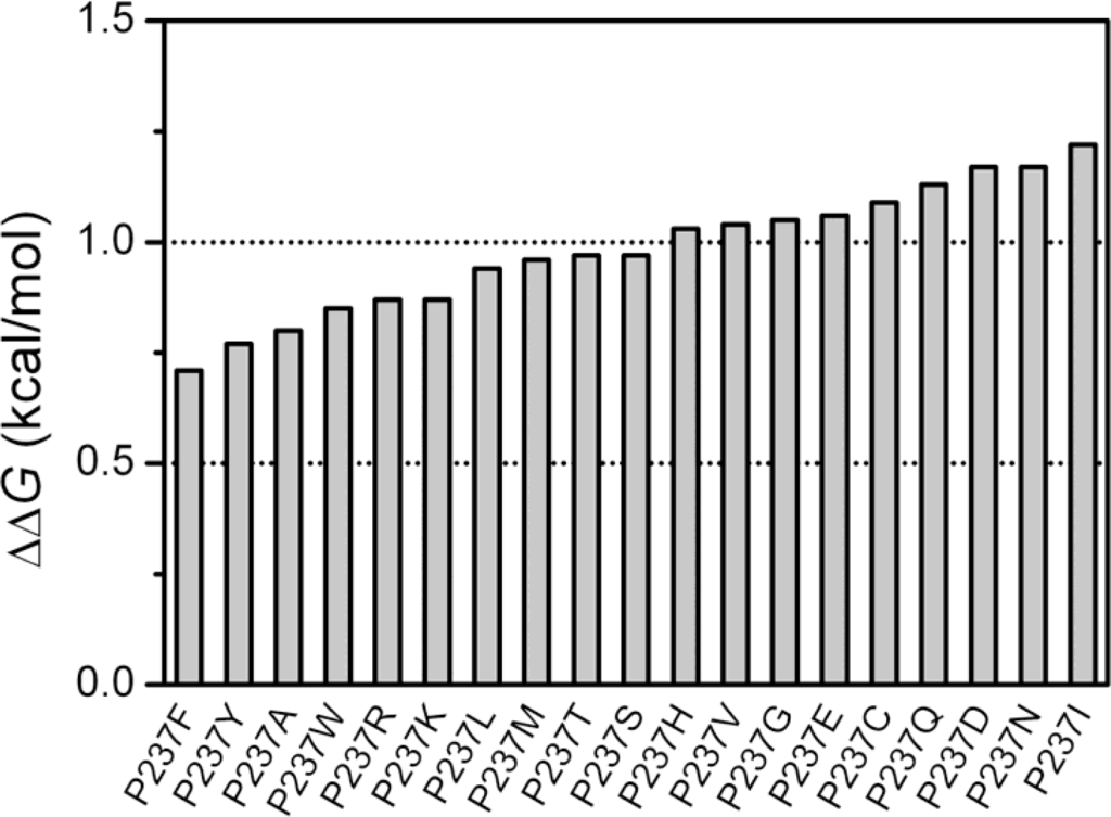 As shown in Figure 2, all the mutations tested had small ΔΔG values around 1 kcal/mol, and the largest change in stability was found to be caused by the P- > I mutation with a value of 1.22 kcal/mol. These results suggest that according to the FoldX prediction, the substitution of Pro at position 237 by any of the other residues did not significantly affect HCAII stability. In other words, Pro237 contributed little to the overall stability of the protein. The large discrepancy between the experimental data (ΔΔG = 7.3 kcal/mol) and the prediction (ΔΔG = 1.03 kcal/mol) of the P237H mutation suggested that the role of Pro237 in HCAII might not be well evaluated by FoldX. In this case, it is necessary to determine the changes in Gibbs free energy by experimental methods. Five typical mutations (P237A, P237T, P237N, P237I, P237F) were chosen for further analysis by folding studies. The choice of P237A and P237T was due to the appearance of these two residues in the sequence of the other species (Figure 1). The other three mutations were chosen because according to the FoldX results shown in Figure 2, P237F was the most stable one among the mutants, while P237I and P237 N were the most unstable ones among the possible 20 natural amino acids.