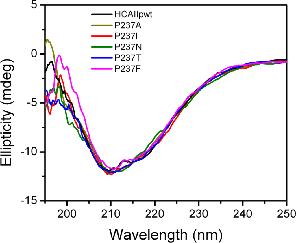 Sequence alignment indicated that the 237th residue of CAII is not fully conserved across all species. However, the P237H mutation of HCAII has been characterized to be a disease-related mutation that significantly destabilizes the protein. The FoldX theoretical calculations suggested that this residue did not significantly contribute to the overall folding of HCAII since a small ΔΔG value (around 1 kcal/mol) was obtained when substituting Pro237 by any other naturally occurring amino acid. The experimental studies indicated that at least three mutations significantly affected the GdnHCl-induced unfolding of HCAII, suggesting that Pro237 is important to HCAII folding. The results also showed that the P237H mutation was the most deleterious among the 19 mutations. The discrepancy between theoretical and experimental results suggested that caution should be taken when using the prediction methods to evaluate the details of disease-related mutations.