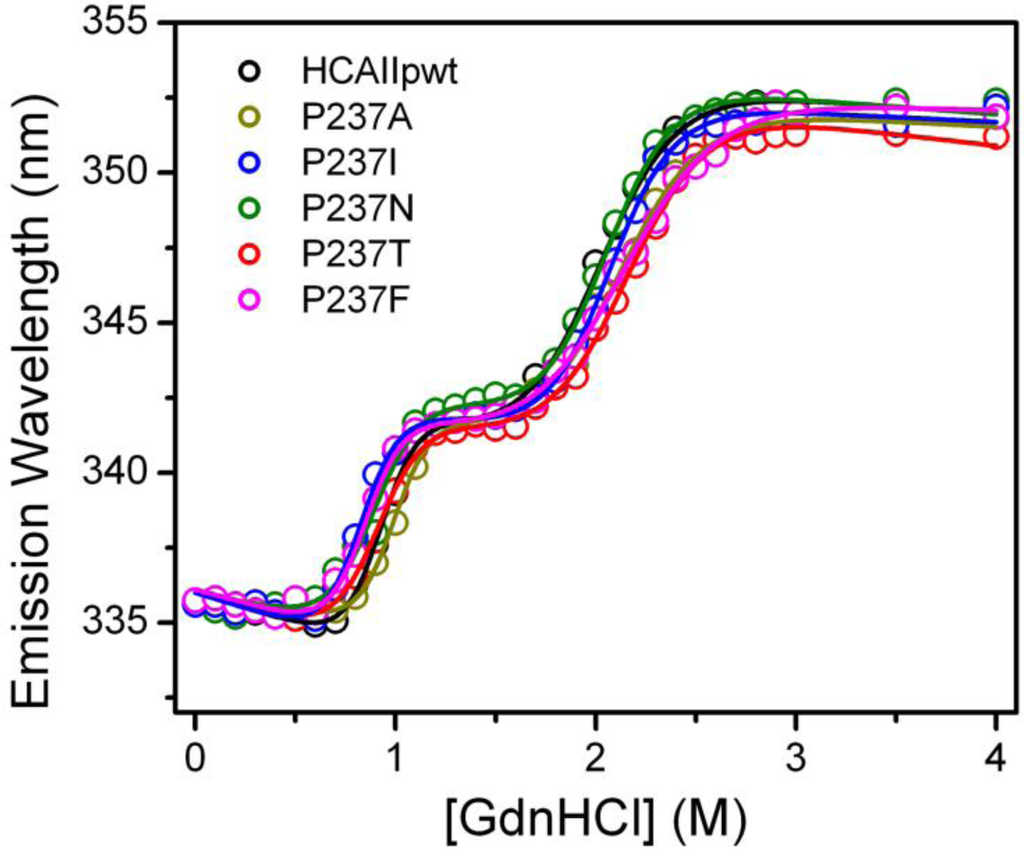 Unfolding transition curves of HCAIIpwt and the mutants monitored by the maximum wavelength of the intrinsic Trp fluorescence. The raw data were fitted by a three-state model and presented as solid lines.