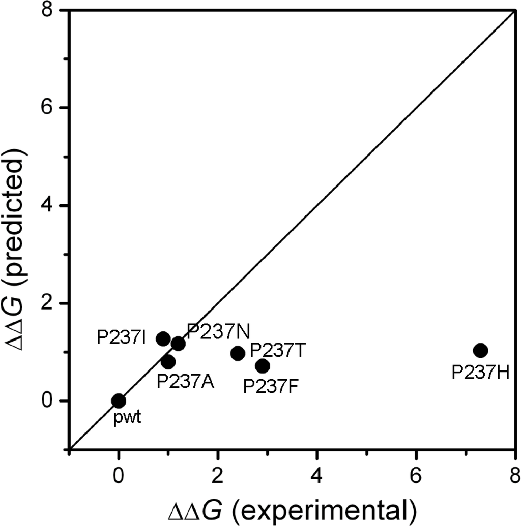 Most mutations slightly destabilize both the N↔I and I↔U transitions except P- > A mutation seems to stabilize the N↔I transition. The ΔΔG values of folding were between 0.9 and 2.9 kcal/mol. The most destabilized mutation was P- > F, while the least was P- > I. This observation was quite different from the FoldX prediction, which indicated that HCAIIP237I was the most unstable and HCAIIP237F was the most stable mutant. The large discrepancy between the theoretical and experimental ΔΔG values for the three mutants HCAIIP237T, HCAIIP237F and HCAIIP237H (Figure 5) suggested that the effects of these mutations could not be predicted correctly. One possible reason is that the FoldX has a correlation coefficient of 0.81 and a standard deviation of 0.46 kcal/mol [20], and another may be that the prediction can give reasonable data of a large data set but not for the details of a small set, as indicated by other authors [32]. Nonetheless, the large experimental ΔΔG values (>2 kcal/mol) caused by the P237T, P237F and P237H mutations implied that the position 237 of CAII should play a role in CAII stability, and the disease-related mutation P237H was the most deleterious.