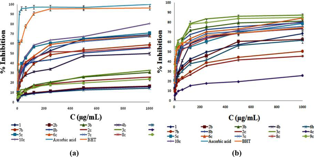 The method used by Takao et al. [30] was adopted with suitable modifications. DPPH (8 mg) was dissolved in MeOH (100 mL) to obtain a concentration of 80 μg/mL. Serial dilutions (3.901–1000 μg/mL) were carried out with the stock solutions of the compounds 1–10c in methanol. Diluted solutions (2 mL each) were mixed with DPPH (2 mL) and allowed to stand for 30 min and 60 min for any reaction to occur. The absorbance was recorded at 517 nm. Control sample was prepared containing the same volume without test compounds and reference compounds. The radical-scavenging activity of the tested samples, expressed as percentage inhibition of DPPH, was calculated according to the Equation (7).