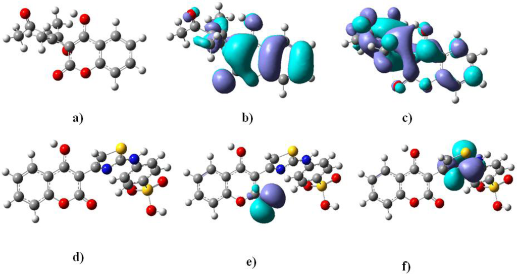 The abstraction of the OH radical occurs in LUMO orbitals of the coumarin double bond system (Figure 2, c and f) which is confirmed by Equation (4). The LUMO orbitals of 6b (widespread trough molecule) and 4c (thiazole N = C) are presented as the OH radical abstraction centers.