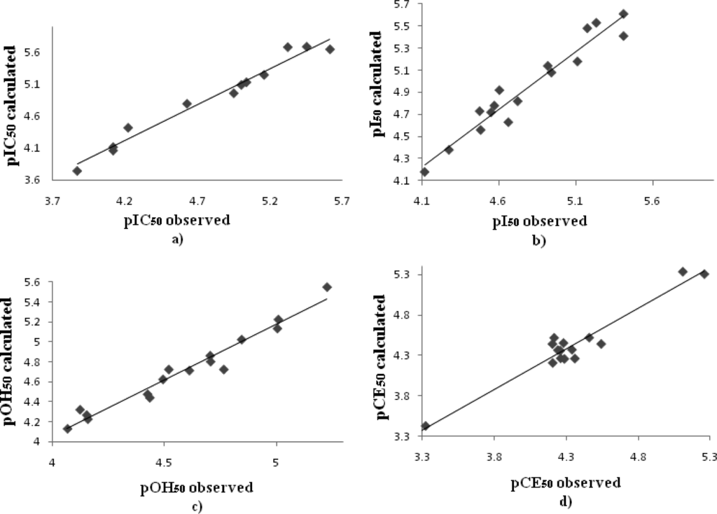 Observed vs. calculated values of coumarin derivatives antioxidant activity from QSAR studies.