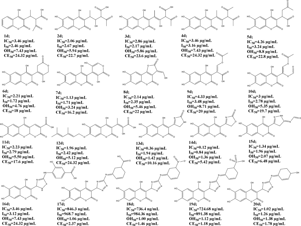 Hence, the number of structural tautomers rises from 3 of compounds 4d and 8d, up to even 10 tautomers of 17d. As the result shows, extended conjugation had improved the overall predicted antioxidant ability. The unfavorable prop-1-ene part of the b condensates had been modified by the total removal of the double bond (1d, 5d), addition of one hydrogen group (12d) followed by the extension of the carbone chain (3d, 4d), or exploiting carbonyl/carboxyl scaffold which led to various lactone and ether structures (6–11d). The sulfur atom in the thiazole ring did not contribute to the scavenging activity (Equations (2), (3)), and so is replaced by the construction of oxazole, pyrazole, imidazole and triazole rings (13–20d). All of the designed compounds had been subjected to the same molecular modeling methods as the original ones and the obtained molecular descriptors were used for the prediction of scavenging and chelating activity using existing QSAR equations. The residue of the triazole ring continued by the Schiff base moiety (17d, 18d and 19d) is presented as the most successful structural modification, which, along with the appropriate –COOH, –SO3H and –NO2 ring substituents, reduced the values of coumarin active concentrations to below 1 μg/mL for the IC50 and I50, and about the same value for the OH50 and CE50. The most promising structure is, therefore, 19d with a predicted DPPH scavenging activity of IC50 = 724.68 ng/mL. The 3,5-dihydroxy-2H-pyran-2-one C-3 structural part (7d) contributed the most to the predicted activity of the compounds that ensued from the carbonyl/carboxyl scaffold modifications. By further synthesis and an antioxidant assessment, the design will be vindicated.