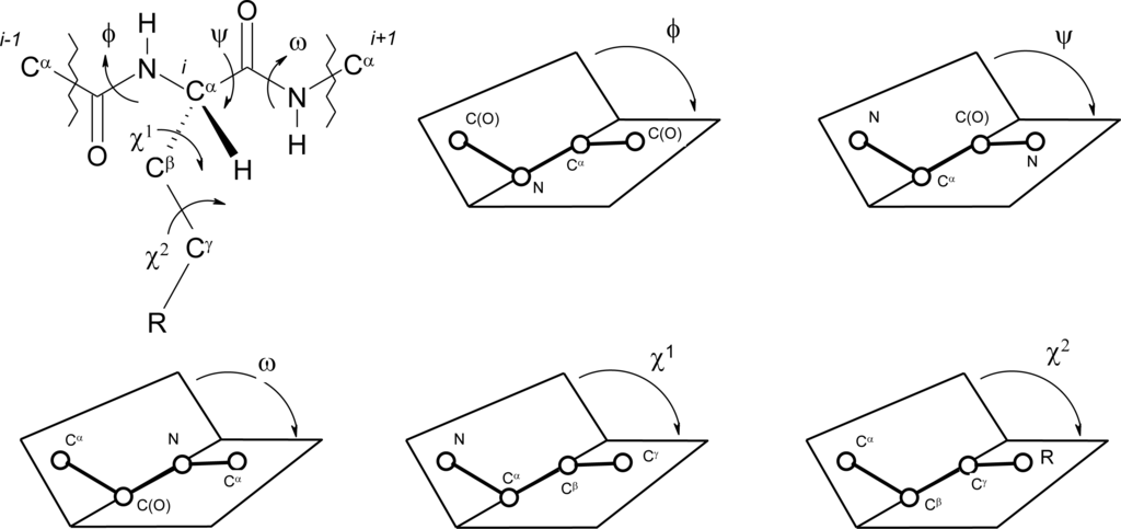 Natural amino acids and peptides exist with a native conformational bias which starts at the backbone level. Torsional (or dihedral) angles commonly used to define the spatial orientation of the backbone peptide bonds and side chains are defined as φ, ψ, ω, and χ as illustrated in Figure 1.
