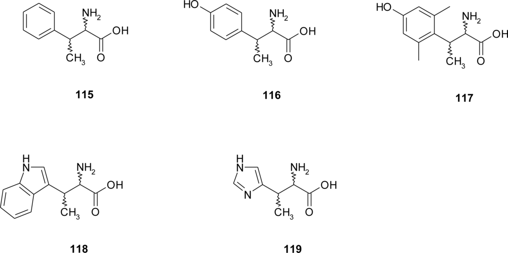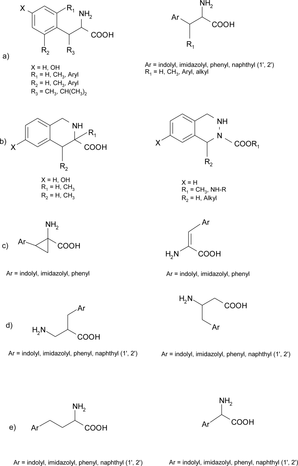 General structure of some χ-constrained aromatic amino acids: (a) β and side chain alkyl substituted amino acids; (b) imino acids; (c) α-β dehydro and α-amino cyclopropanecarboxylic acid derivatives (ACC); (d) β2/β3-homo-amino acids; (e) homo and nor-amino acids.