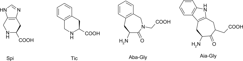 During the design based on the topographical χ space control, authors concentrated their major efforts on aromatic amino acids. All peptide hormones and neurotransmitters have in fact one or more aromatic amino acid residues as key pharmacophore. Different structural features, chosen in order to constrain the χ space of aromatic amino acids, are shown in Figure 3.
