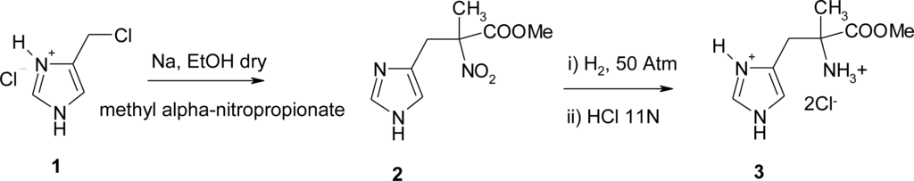 An early synthetic method (reported by Robinson and Shepherd []) for the α-substituted product 3 is the coupling reaction between methyl α-nitropropionate and chloromethylimidazole 1 to give 2 followed by reduction of the nitro group (Scheme 1).