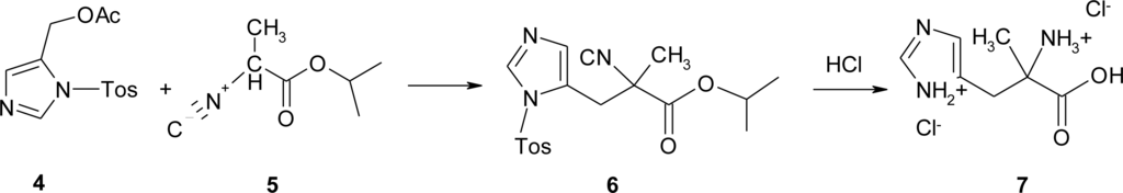 Successively (1974), Suzuki et al., found that N-tosyl-acetoxy-methylimidazole [] 4, easily prepared from hydroxymethylimidazole [], is a useful intermediate for the introduction of imidazole ring in the amino acid skeleton. Accordingly, α-methylhystidine was synthesized by reaction of α-isocyanoproprionate 5 with N-tosyl-acetoxymethylimidazole 4, as shown in Scheme 2.