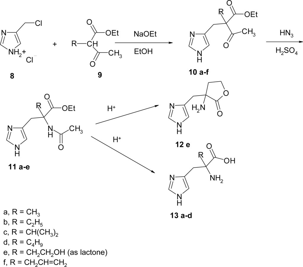 Two years later DeGraw et al. used the route outlined in Scheme 3 to synthesize α-substituted histidines. 4-Chloromethylimidazole hydrochloride 8 [], was added to a solution of an appropriate 2-alkyl acetoacetate 9a–d,f or 2-acetylbutyrolactone 9e in ethanol solution containing sodium ethoxide to afford the 2-alkyl 2-(4-imidazolylmethyl)acetoacetate 10. When the keto ester 10 was allowed to react with a slight excess of hydrazoic acid in sulfuric acid solution, the N-acetylhistidine esters 11a–e were obtained in 50–70% yields. Under the acidic conditions employed, the α-allyl-analogue 10f was apparently subjected to additional attack on the vinyl moiety, leading to an unidentified product rather than the anticipated product 11f. Schmidt [] had qualitatively shown that in β-keto esters the HN3 reagent afforded selective attack on the ketone carbonyl with subsequent rearrangement occurring at the α-carbon. Synthesis of the histidines 12 and 13 were completed by acid hydrolysis of the amide and ester functions. This route seems to have been little used in the synthesis of α-substituted amino acids, but especially valuable in the histidine series.
