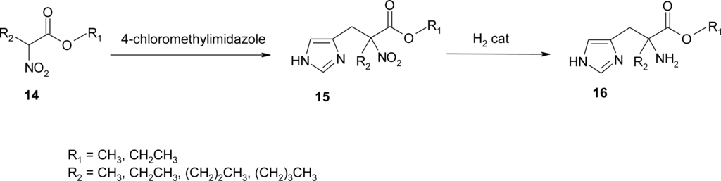 An alternative synthesis (Scheme 4) of α-substituted histidine was proposed by Kelley in 1977. The synthesis was modeled after the work of Robinson and Shepherd [] and Sletzinger and Pfister [], as outlined in Scheme 4.