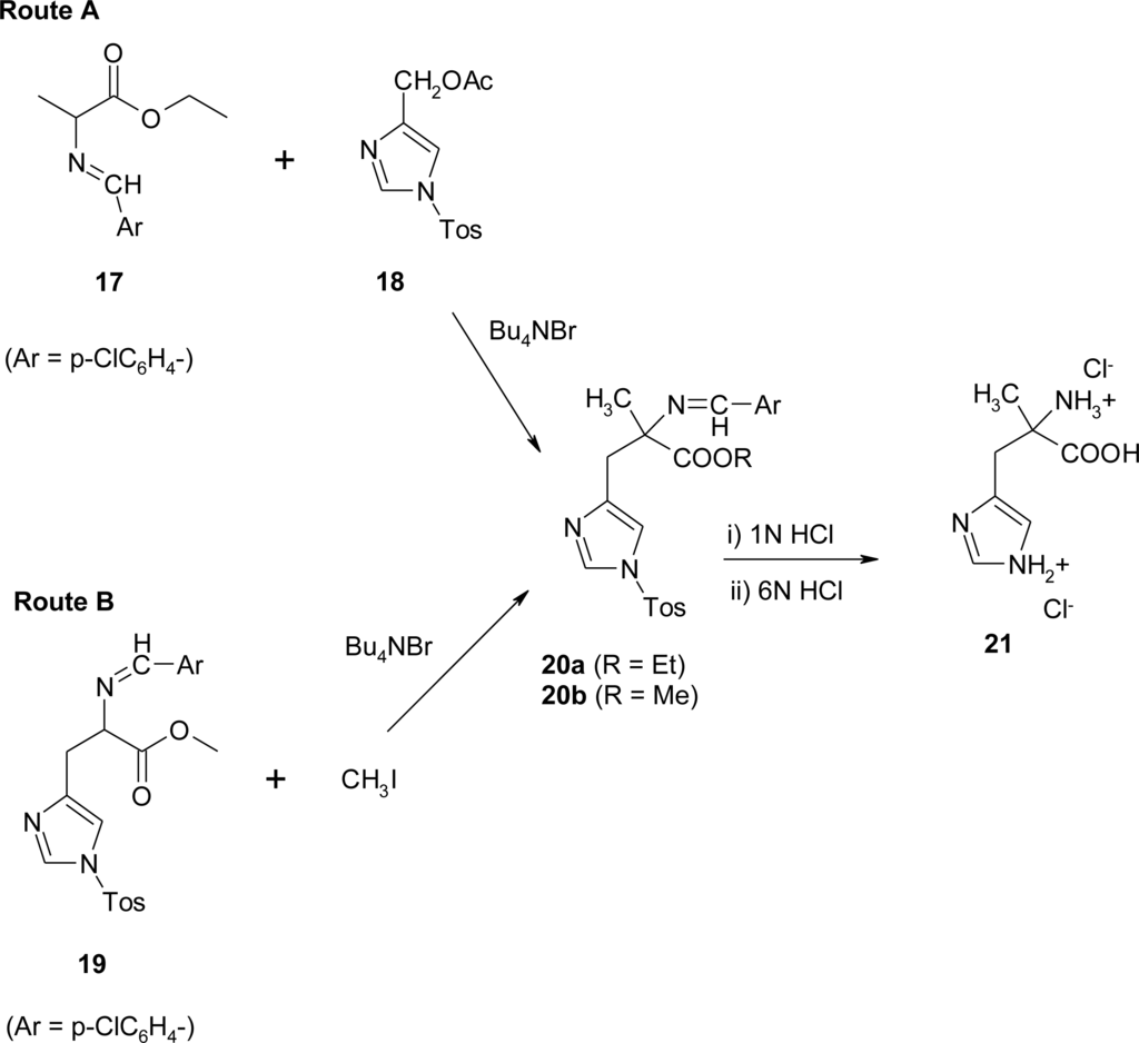 The first route involves benzylation of the Schiff base ester 17, prepared in 90% yield from alanine ethyl ester hydrochloride and p-chlorobenzaldehyde, with the electrophile 18 []. In the second approach the appropriately protected histidine substrate 19 is α-methylated by using the PTC method. The intermediate 19 is easily prepared in 83% yield in one pot procedure from histidine methyl ester dihydrochloride by condensation of the free amino ester (generated in-situ) with p-chlorobenzaldehyde followed by protection of the imidazole nitrogen with tosylchloride/triethylamine. Alkylation of 17 or 19 was accomplished by catalytic solid-liquid phase transfer alkylation using powdered potassium hydroxide in acetonitrile at 15–20 °C with 10% Bu4NBr as the phase-transfer catalyst. The crude alkylated derivatives 20 (20a, R = Et, 47% crude; 20b, R = Me, 70% crude), obtained as oil, were hydrolyzed directly in a two-steps sequence. The product α-methyl histidine was obtained as its dihydrochloride 21 in overall yields of 27% and 41% from 17 and 19, respectively.