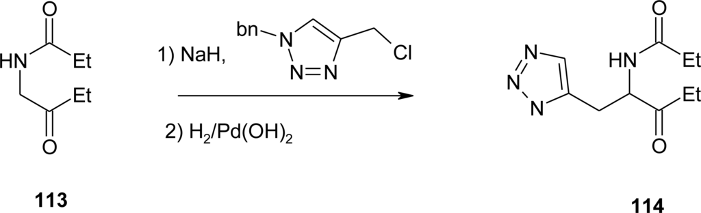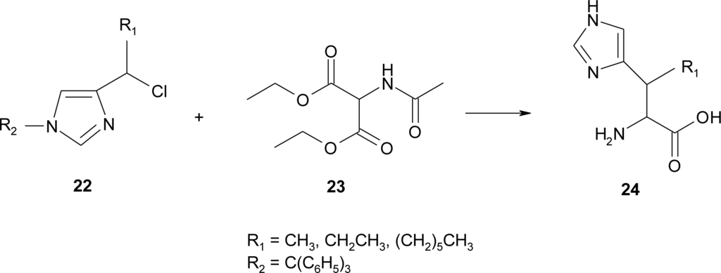 A synthetic route for β-alkylhistidines 24 was reported by Kelley [] and co-workers as a modification of Albertson’s classic synthesis of histidine [], by using the appropriate 1-(4-imidazolyl)alkyl chloride 22 and the diethyl acetamidomalonate 23 (Scheme 6).