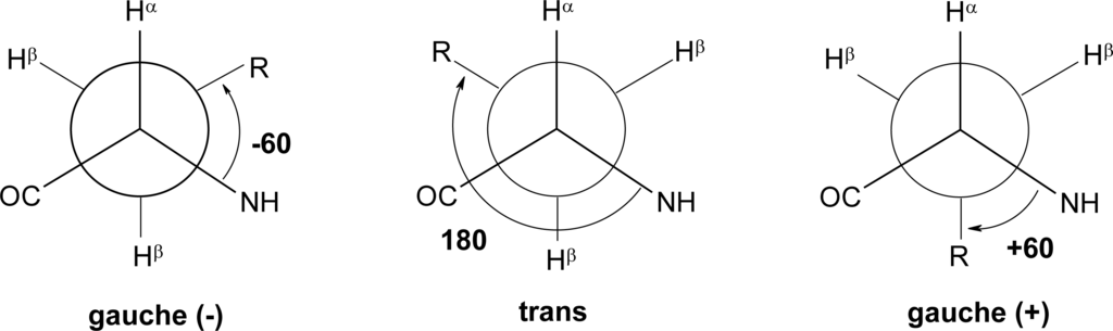The χ1 torsional angles are well illustrated by referring to the Newman projection (Figure 2). There is an energy barrier between the discrete angles, with values of +60°, −60°, and 180°having the most favorable energies.
