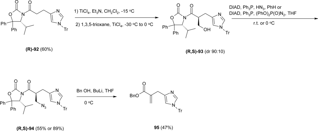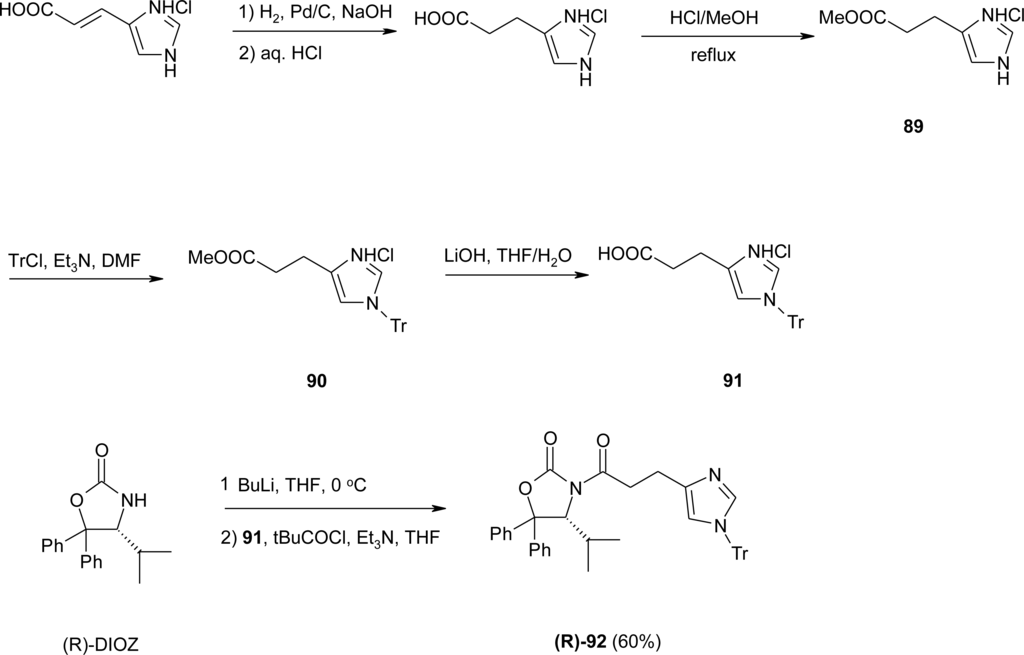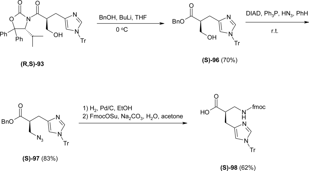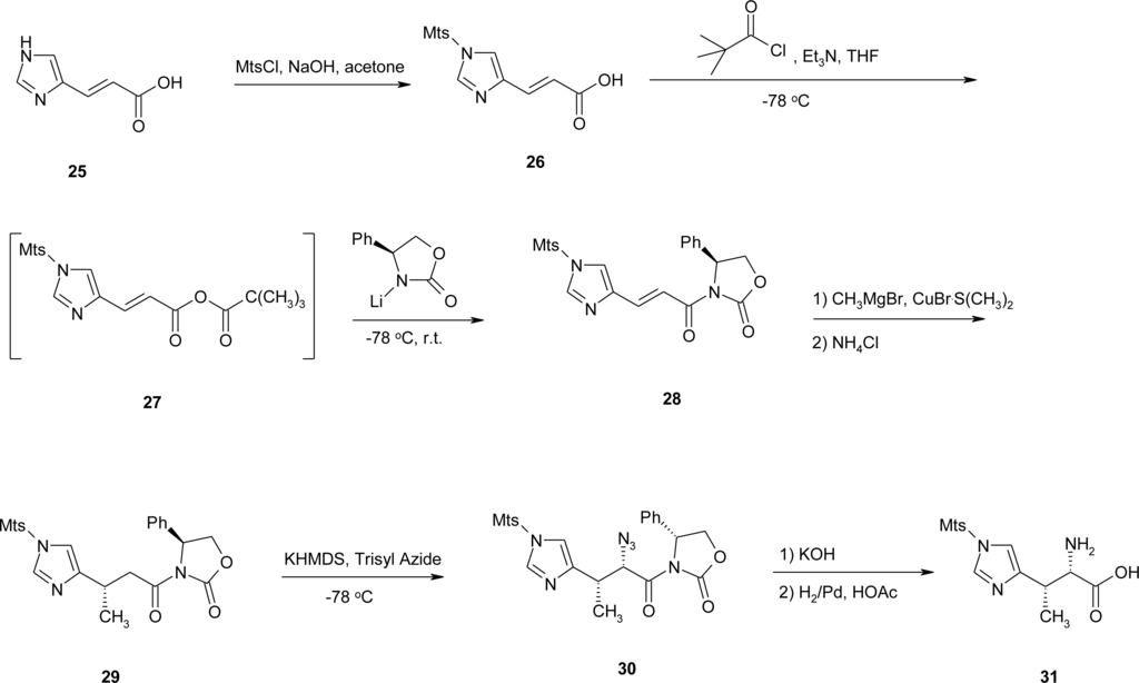 The synthesis started from the commercially available urocanic acid 25. This was treated with 2-mesitylensulfonylchloride MtsCl in sodium hydroxide solution to furnish the derivative 26 τ-N protected at the imidazole ring. The protected urocanic acid was coupled by mixed anhydride method 27 to an optically pure chiral auxiliary according to a reported procedure [] to give 28. The subsequent Michael addition and azide formation followed a highly enantioselective route (>99% as determined by 1H NMR). Hydrolysis of the chiral auxiliary 29 to compound 30 led to the removal of the Mts-protecting group. The final unprotected β-methylhistidine 31 was isolated, purified by ion-exchange column (Dowex 50X2-100) and recrystallized from water/ethanol []. According to the 1H NMR spectra some epimerization was observed in the last two steps; thus the Mts- or another protecting group should be reintroduced for this use in peptide chemistry. Although the free imidazole group can apparently catalyze the epimerization process, the adoption of the Mts protection allowed the first successful asymmetric synthesis of a (2S,3S)-β-methylhistidine derivative.