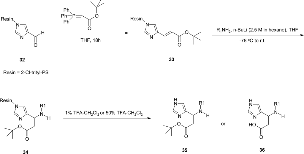 Recently, Saha et al. [] synthesized β-amino acids based libraries on solid support, ancoring 4-formyl imidazole to 2% cross-linked PS-resin using the convenient 2-Cl trityl linker. Horner-Emmons condensation was conducted on resin bound aldehyde with an excess of tert-butylcarboxy triethyl phosphonoacetate in THF 32. Lithium amides have been utilized in conjugate Aza-Michael additions to α,β-unsatured systems for the generation of protected chiral β-amino acids 34 []. The amides were generated by pre-treating several amines with n-BuLi in THF at −78 °C. The resulting lithium amides were added via cannula under N2 to a pre-swelled suspension of resin 33 in THF, maintained at −78 °C. Then, the mixture was warmed to room temperature followed by work up procedure. Cleavage after Aza-Michael addition, under mild-TFA conditions produced the tert-butyl ester products 35. Cleavage with 25–50% TFA-CH2Cl2 gave the deprotected β-amino acid products 36 (Scheme 8).