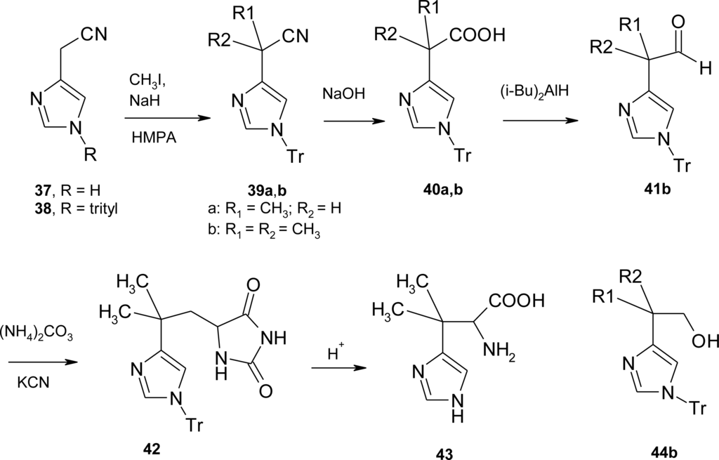 β,β-dimethyl histidine 43 was prepared by the procedure shown in Scheme 9; 4-cyanomethylimidazole 37 was conveniently obtained in 70% yield from histidine by decarboxylation in sodium hypochloride solution [].