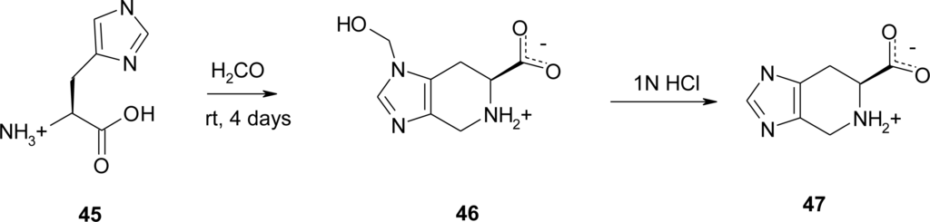 l-Spi has been also synthesized under different experimental conditions which gave, as an intermediate, its Nπ-hydroxymethyl derivative Spi(π-MeOH) [] 46. In this case, the starting l-His in 0.1 M sodium phosphate buffer (pH 7.0) was reacted with a 30-fold molar excess of formaldehyde at room temperature for 4 days; the precipitate was collected by filtration, washed with cold water and dried. The product, separated from the reaction medium as crystal suitable for X-ray diffraction, was obtained in 93% yield (Scheme 10). The obtained Spi(π-MeOH) 46 was dissolved in 1 M HCl and the solution concentrated at reduced pressure. The residue 45 was dissolved in water and the pH adjusted to 3.5. Absolute ethanol was added, obtaining crystals which were collected by filtration, washed with ethanol and dried (95% yield).