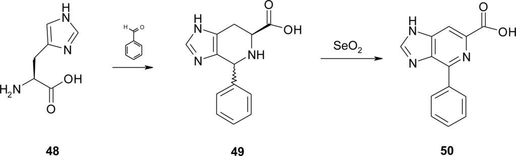 In particular, the 1-phenyl derivative 50 was synthesized by the method of Wille [] through the base-catalyzed Pictet-Spengler reaction of histidine 48 with benzaldehyde. Aromatization of the tetrahydroimidazopyridine derivative 49 with selenium dioxide readily afforded 50 as free base.